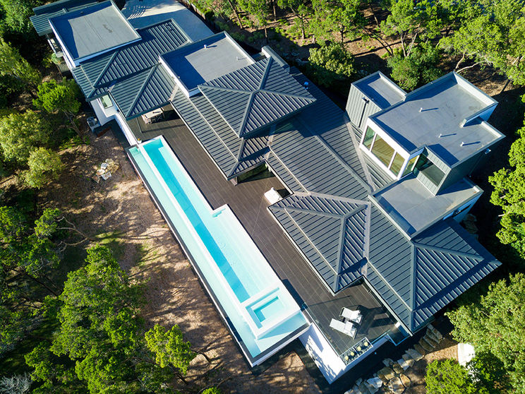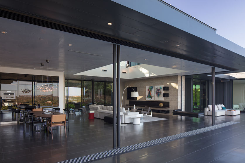 features large window fronts that provide a visual connection to the surrounding nature. The different geometric shapes and materials used – ranging from concrete to natural stone – create a multifaceted cubic exterior encouraging passers-by to take a closer look. A successful