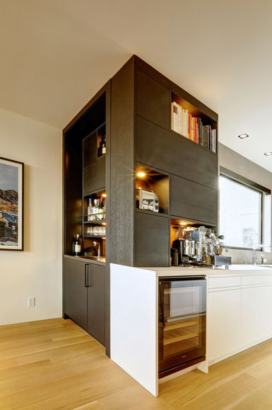 The bar in the loft kitchen with plenty of storage and shelving space – coordinated down to the very last detail; pure enjoyment and conviviality.